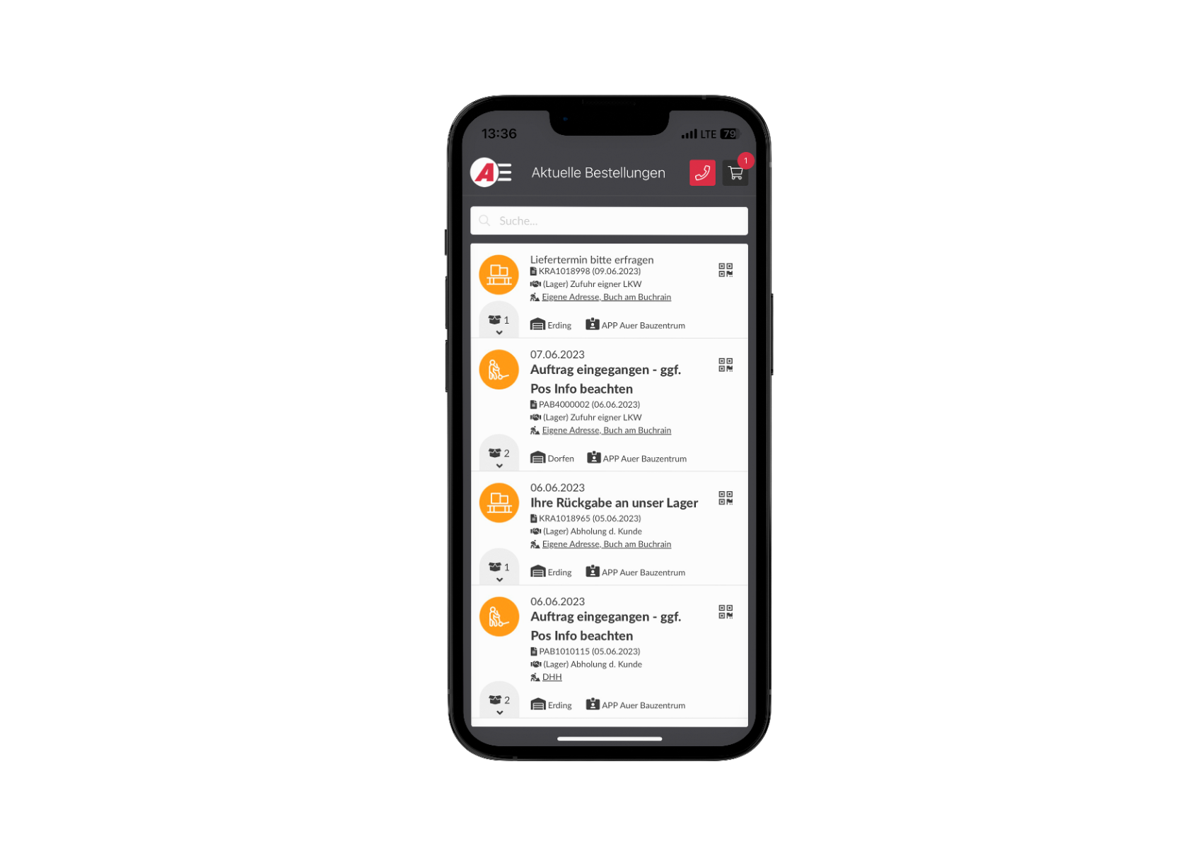 Alle Details zu meiner Bestellung? Wann wird geliefert? Wo hole ich die Ware ab? Die AUER Baustellen App gibt Antworten auf alle Fragen. So haben Sie jederzeit die digitale Kontrolle über alle anstehenden Lieferungen – und alle wichtigen Informationen im Blick: einfach, komfortabel und schnell – 24/7.