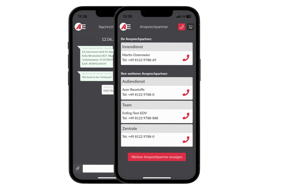 Über die AUER Baustellen App haben Sie alle Telefonnummern Ihres AUER Teams griffbereit und können Ihren persönlichen Ansprechpartner schnell kontaktieren. Ihre Anfragen und Nachrichten können Sie uns zudem über die Chat-Funktion unkompliziert schicken. Hier lässt sich vieles schnell und einfach mit unserem Team abklären – auch wenn es auf der Baustelle einmal etwas lauter ist.