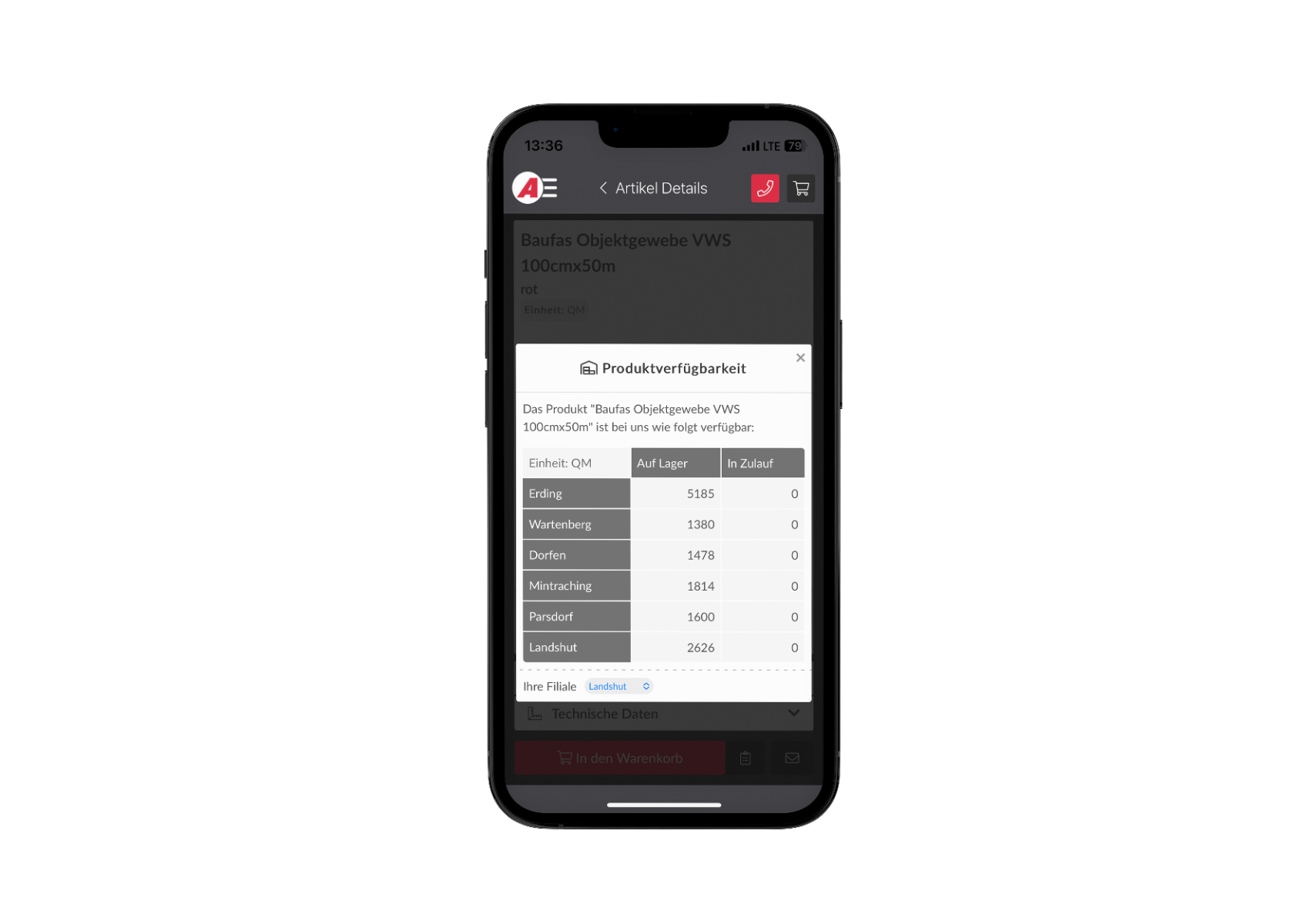 Mit dem Artikel Check prüfen Sie schnell Verfügbarkeiten in unserem Lager und nehmen unkompliziert direkt Bestellungen vor. Darüber hinaus können Sie über die App jederzeit Ihre Lieferungen abfragen und Ihren aktiven Baustellen wichtige Fotos hinzufügen und diese dort verwalten.